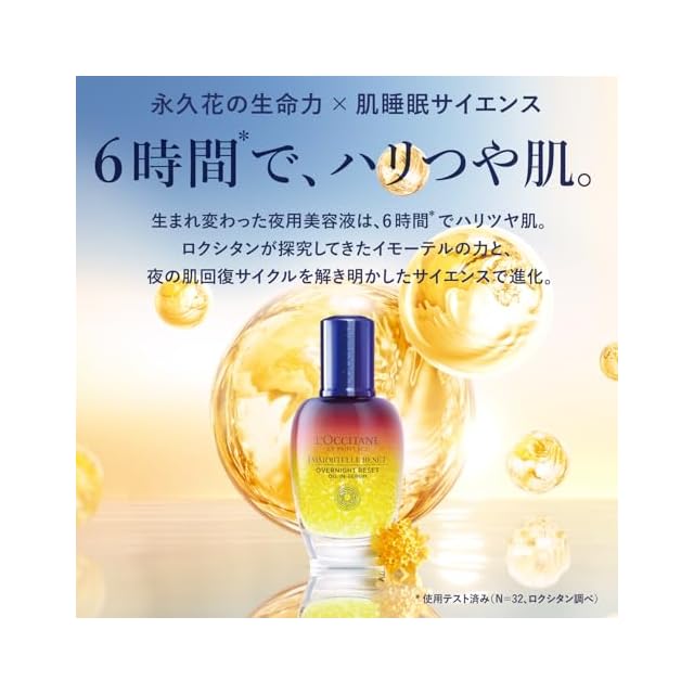 生まれ変わった夜用美容液は、たとえ思い通りの睡眠がとれなくても、6時間(*)でハリつや肌へ。 (*)使用テスト済み(N=32 ロクシタン調べ)