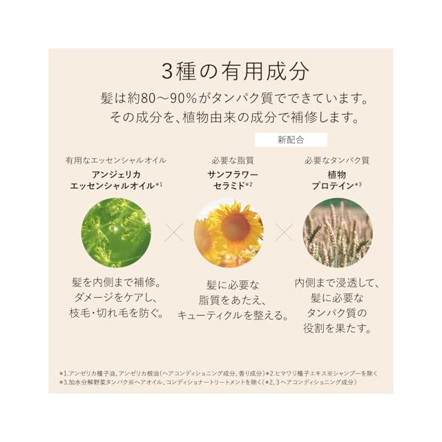 髪の内側まで集中ダメージ補修し、うるおいを閉じ込めて指通りなめらかな髪に導くヘアコンディショナー(詰め替え用)2本セット。 髪を構成する成分と同じような働きをする植物由来成分が、空洞化した髪を集中補修。 アンジェリカエッセンシャルオイル(*1)が髪のダメージをケアして枝毛・切れ毛を防ぎ、サンフラワーセラミド(*2)が髪に必要な脂質をあたえ、キューティクルを整えます。