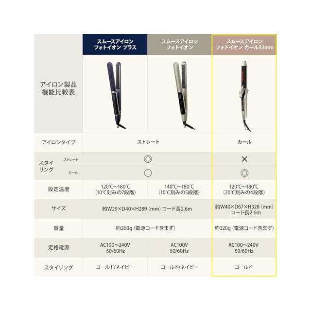 YA-MAN スムースアイロンフォトイオン カール 32mm / YJHB1N / サイズ:約W40×D67×H328(mm)※コード長2.6m / 重量:約310g(電源コード含まず) / セット内容:本体、取扱説明書(書付) / 定格:AC100~240V 50/60Hz、消費電力:66W、設定温度:120~180℃(20℃刻みの4 段階) / 製造国:中国
