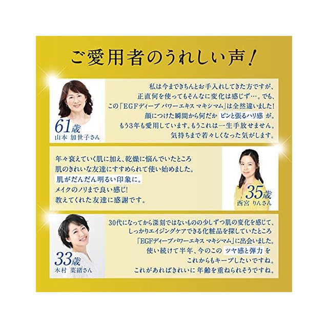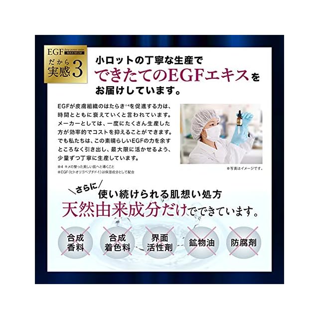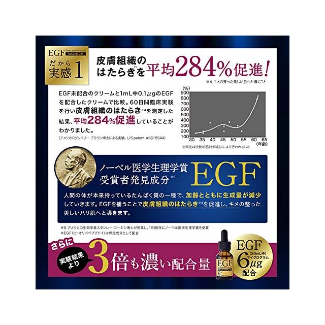 【最高濃度でハリ肌実感!】メーカー推奨濃度の3倍、6マイクログラムも配合した、高濃度タイプのEGF原液美容液です。少量ずつの丁寧な生産により、できるだけ作り立てのフレッシュなEGFエキスをお届けするよう努力しております。ぜひEGFの素晴らしい力を実感してください。