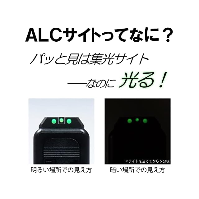 【高性能な蓄光材を採用】非常に高い視認性と残光性を持つ蓄光アクリルを採用しました。 フラッシュライトを数秒ほど照射するだけでも、十分に暗闇の中でサイトを視認できます。 実際の使用環境を考慮し、発光持続性とともに良好な視認性能と残光性能にこだわった蓄光材となります。 ※トリチウムなどの放射性物質は使用しておりません。