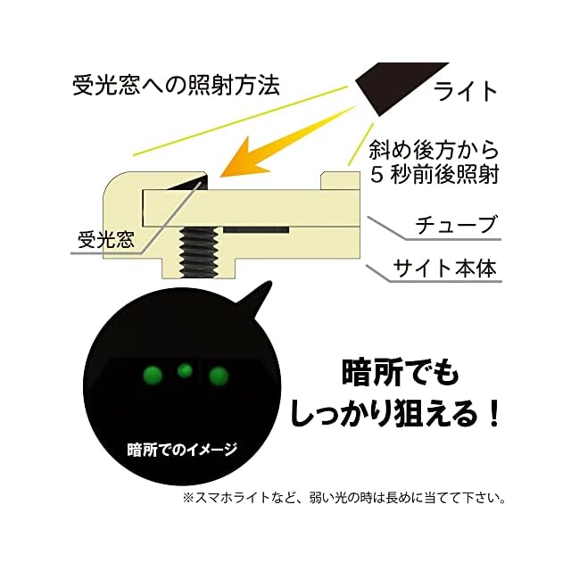 【日中はホワイトドットとして、暗闇では蓄光ドットとしてサイティングを可能にしたサイトです】取付け部の形状は純正互換ですので、簡単に取り付けられます。 蓄光ドットは、自然光でも十分に光を蓄えるため普段は意図的にライトなどを照らす必要はありません。 より強く光ってほしい時などはライトで数秒間光を当てて使用してください。