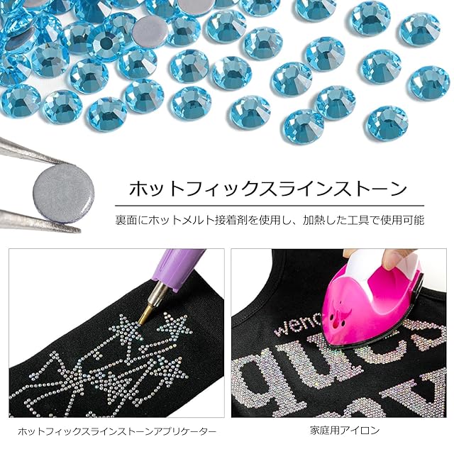使用は簡単:ガラスラインストーンの裏面にホットメルト接着剤があらかじめ付けられています。フラットバックラインストーンを固定するには、家庭用アイロンまたはホットフィックスラインストーンアプリケーターをご使用ください。熱を加えずに接着剤を付けての使用も可能です。
