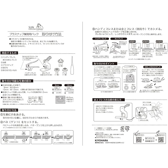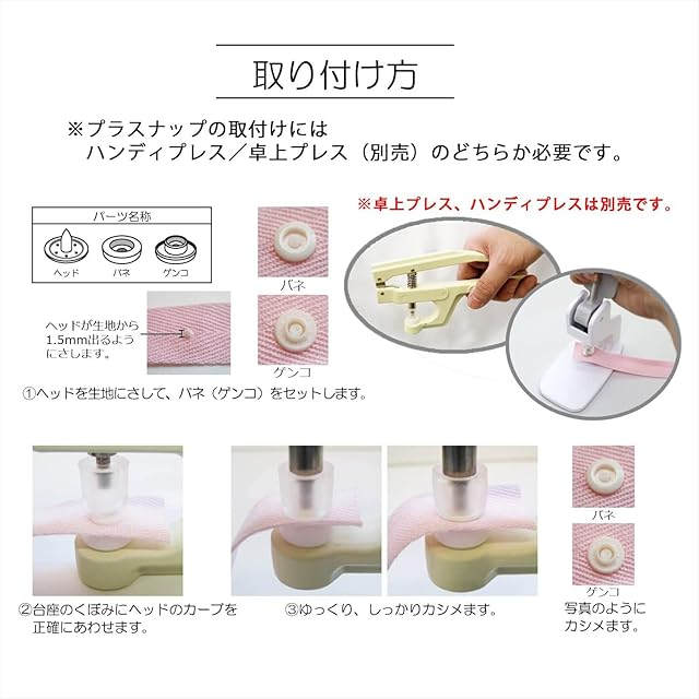 糸 ・ 針 不要で取り付けられる プラスナップ 。 金属アレルギー の方にも安心の プラスチック 製。