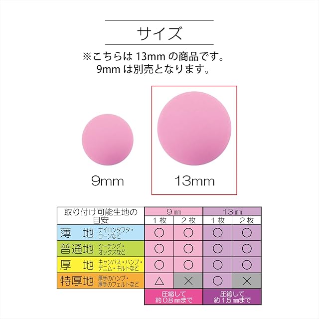 プラスナップのサイズ:直径約13mm / 取り付けに最適な 生地 の厚み:圧縮して約0.8mm