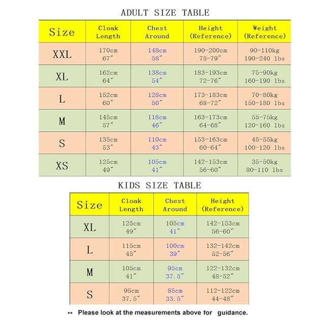 子供 サイズ表: S 丈: 95cm 胸囲: 85cm 身長:112-122cm M 丈: 105cm 胸囲: 95cm 身長:122-132cm L 丈: 115cm 胸囲: 100cm 身長:132-142cm XL 丈: 125cm 胸囲: 105cm 身長:142-152cm