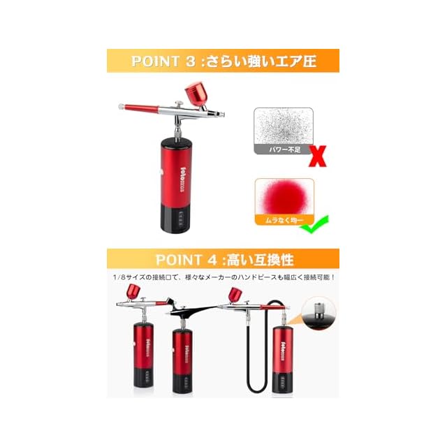 【高い互換性、さらに強いエア圧!】 接続ネジは最も一般的な1/8サイズを採用し、様々なメーカーから販売されているハンドピースをアタッチメントなしで取り付けることが可能になりました。※ガンダムマーカーの接続には市販の1/8オス変換ネジ(別売り)が必要です。幅広く接続が可能で、お好みのほぼ各種類のハンドピースと自在に使用できます!さらに、他社の17psi最高圧力に対して、弊社の新モデルは25psi最高圧力を持ち、弱いエアー圧による効果低下を改善し、優れた塗装効果を実現します。
