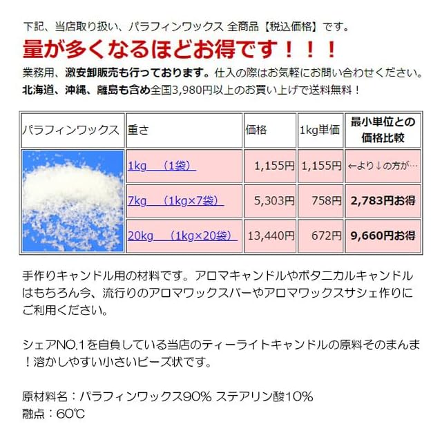 パラフィンワックス ステアリン酸 混合パック 1kg 手作りキャンドル 材料 1キロ アロマワックスサシェ