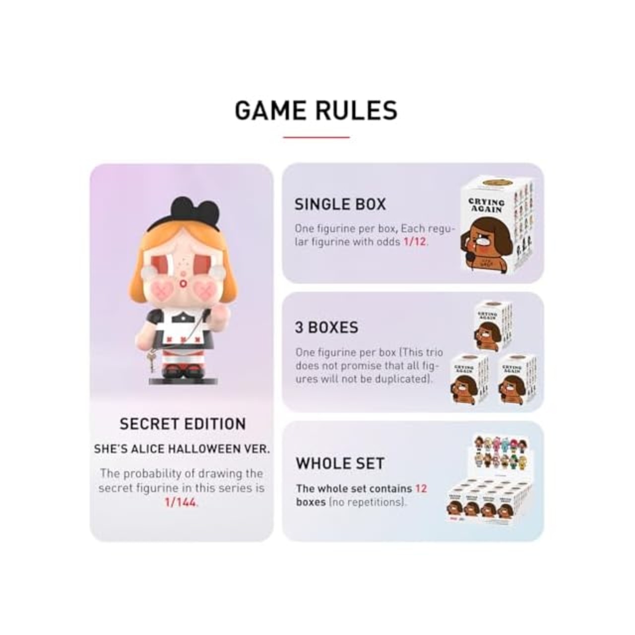 【各キャラクター名称】BABY BROWN BABY BLONDE HEARTLESS GIRL STAR BOY LOVE IS LOVE THE ROBBER SHE'S ALICE LOVE MAKES US CRY I'LL GIVE YOU ALL MY L I'LL BRING YOU A FLOWER WHAT A FROG DUCK YOU THE ROBBER RED VER. SHE'S ALICE HALLOWEEN VER. THE QUEEN OF BROKEN HEART