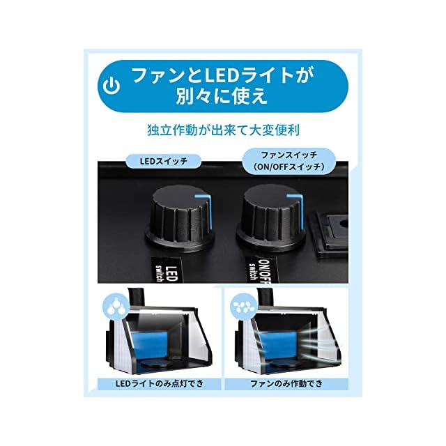 ファンとLEDライトが別々に使え:Anesty塗装ブースは他のものと違いファンとLEDライトに個別にスイッチがありますので、独立作動が出来て大変便利になるスプレーワークシステム 。(ファンのみ作動でき&LEDライトのみ点灯でき)