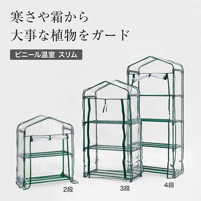 工具いらずで組立簡単。パーツを差し込んでビニールをかぶせるだけ。寒さや霜から大切な植物を守る。 シンプルで、使いやすい簡易温室。奥行き約32cmのスリムタイプで、ベランダや狭小スペースに。このビニール温室は、ビニールを全てとりはらって使用できるため、夏の暑い日でもビニールをはずすことができます。