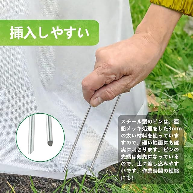 【挿入しやすい】スチール製のピンは、亜鉛メッキ処理をした3mmの太い材料を使っていますので、硬い地面にも確実に刺さります。ピンの先端は剣先になっているので、土に差し込みやすいです。作業時間の短縮にも!