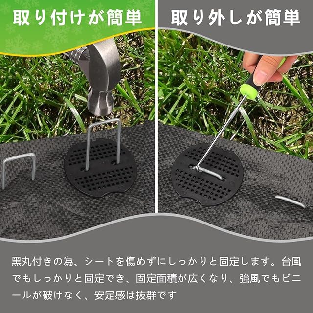 【しっかり固定】黑丸付きの為、シートを傷めずにしっかりと固定します。台風でもしっかりと固定でき、固定面積が広くなり、強風でもビニールが破けなく、安定感は抜群です 。