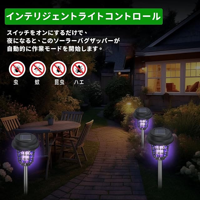 蚊取り電撃殺虫器 屋外 蚊除け 最強 ソーラーライト ガーデンライト 充電式 蚊取りと照明両用 防水 静音 省エネ 置く 光源誘引式 360°強力蚊除け 虫除け コバエ取り 殺虫機 虫対策 配線不要 埋め込み 自動点灯捕虫器 殺虫ライト ガーデンライト 庭/園芸/玄関/アウトドア 殺虫ライト (2pcs) | つむぎ屋