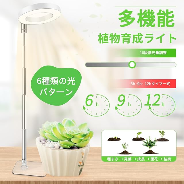 【調光可能】10段階の明るさ調節、3種類の光モード(白色、暖色、赤色+全灯)、さらに自動ON/OFFタイマー(3時間・9時間・12時間)付き。植物にとって最適な育成環境を作ります。