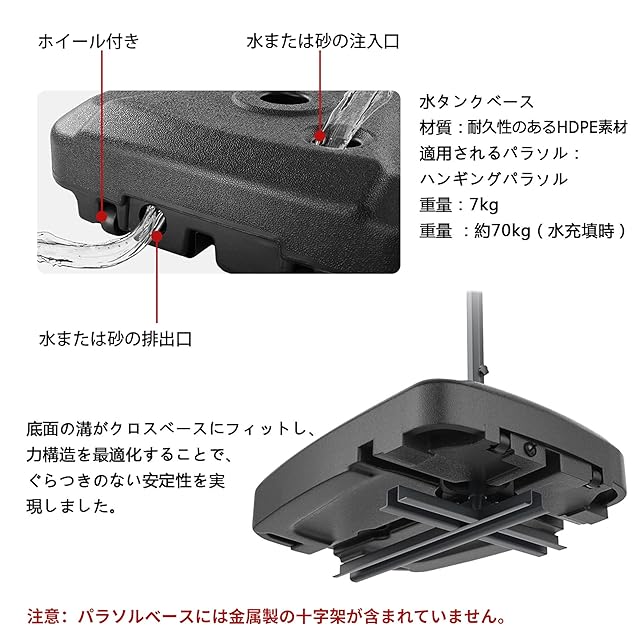 ※【60Lパラソルベース】: ViCoopZimパラソルベース内容:60Lの水タンクベース。【注意事項】: ※パラソルベースには金属製の十字架が含まれていません。 ※パラソルとパラソルベースは別売りです。あなたのパラソルをより安定して安全にするために、水タンクベースを別途購入することをお勧めします。(水タンクベースの購入は、以下を検索してください:60Lベース:B0BXSMZ4PN、80Lベース :B0CWG9WFG7)