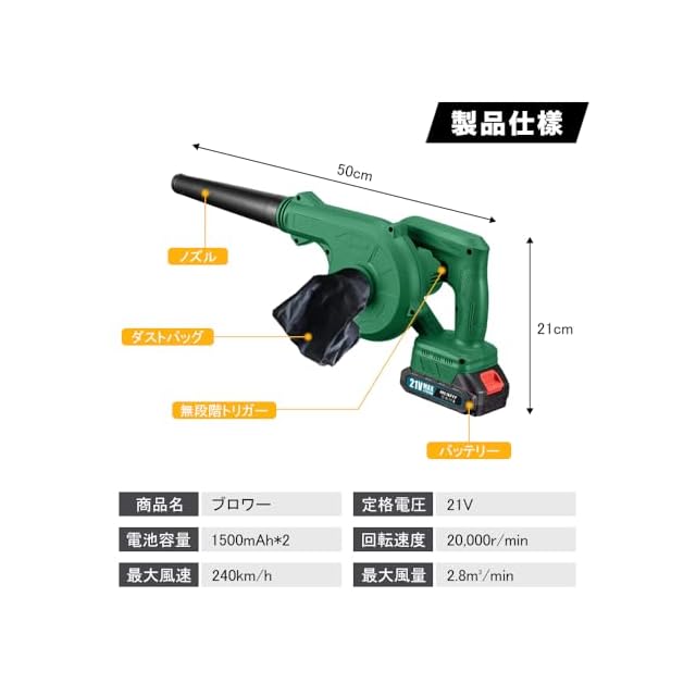 【バッテリーと充電器付属】21V 1.5Ahリチウムイオンバッテリー*2個付き、出力300Wで、10分間の連続使用が可能です。電源が切れる心配はありません。特殊な保護回路チップの搭載しているため、過電流保護・過電圧保護・過熱保護・充電保護機能があり、未然に防ぎ、いつでもどこでも安心に使用いただけます。