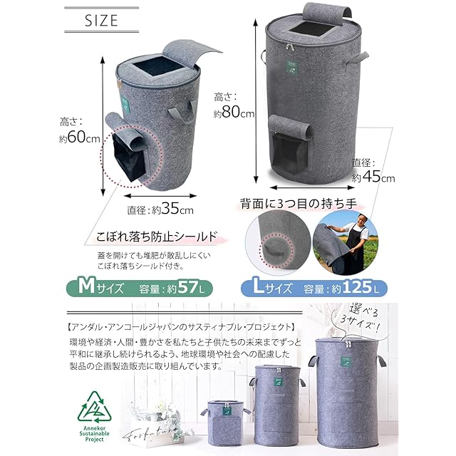 Andall コンポスト 容器 【おしゃれに堆肥作り 説明書付】 家庭用 生ゴミ処理機 コンポスター コンポストバッグ 生ごみ 堆肥 肥料 不織布 脱臭 防カビ 生ゴミ堆肥化容器 ベランダ アンダル (Lサイズ グレー 125L) | つむぎ屋