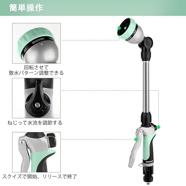 RESTMO 金属散水ワンド スプレーランス 頑丈なホースワンド 180°調節可能なラチェットヘッド 7つのスプレーパターン 延長ホースワンド 庭用スプレーガン 水掛けバスケット 流量コントロール 青緑 | つむぎ屋