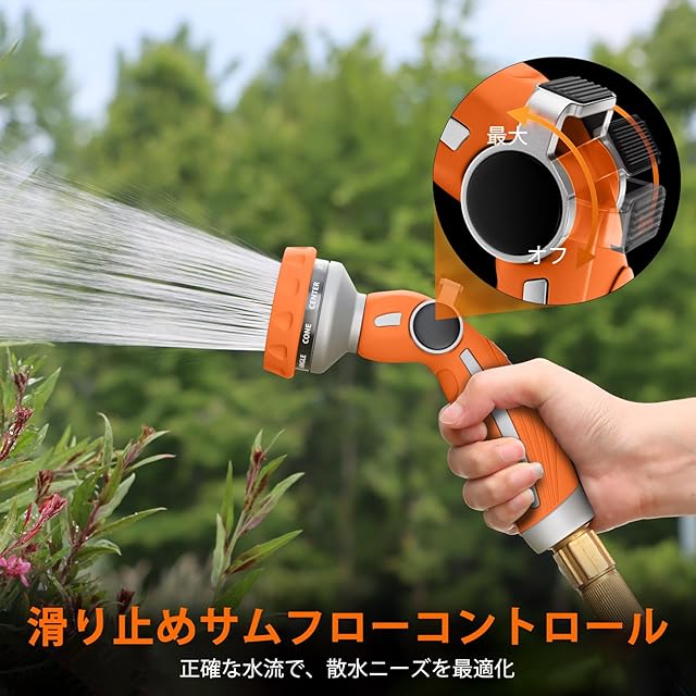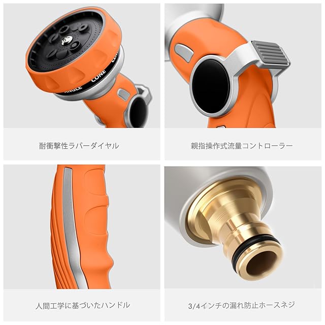 【人間工学に基づいたデザイン】ユニークな形状のハンドルで、このホースノズルは複数のサイズの手に対応します。柔らかいTPUゴムで80%コーティングされ、滑りにくいグリップです。細くて繊細な手でも、丈夫で力強い手でも、水やりの時に手の疲れを忘れ、いつも快適に感じることができます。