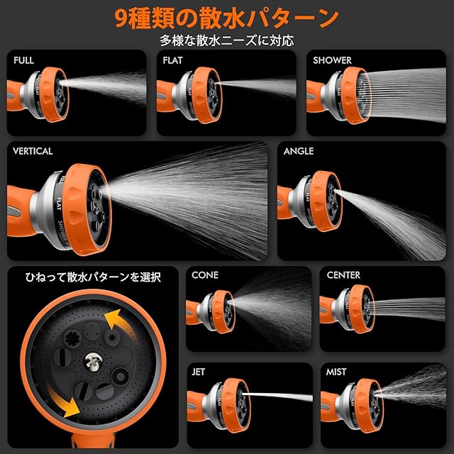 【9つの散水パターン】スプレーヘッドのダイヤルを回して、シャワー、フラット、フル、ミスト、ジェット、センター、コーン、アングル、垂直から散水パターンを選択できます。中庭の掃除には高圧ジェット、洗車には便利なアングル、愛犬の洗車には優しいシャワー、庭の花の水やりにはソフトなミストなど、9つのパターンですべてカバーできます。