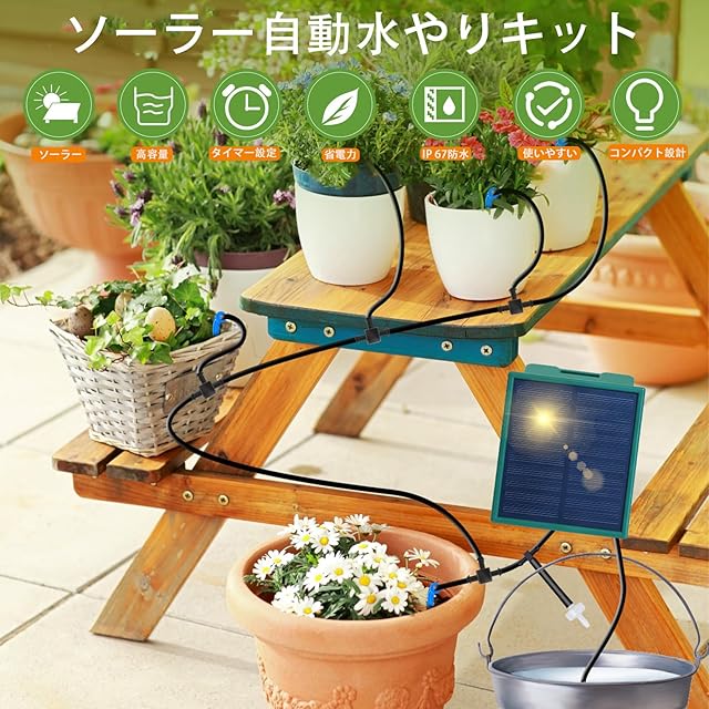 多機能:点滴水やりシステムキットには、ソーラーモジュール、10メートルホース、10個ドリッパー、サイフォン防止、フィルタ、説明書が含まれている。花園は芝生水やり、テラス、花園、野菜水やり、盆栽、花壇、温室などに適している。水やりはゆっくりと均一で、植物の成長はもっと良い。