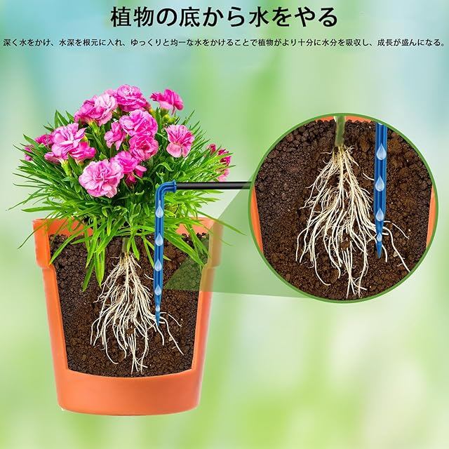 【重要なヒント】鉢植えごとに同じ水量を得るためには、鉢植えごとに点滴管の高さがほぼ同じであることを確認し、出水口にサイホン防止装置を設置して、水槽が植物より高いときにサイホンを吸わないようにしてください。