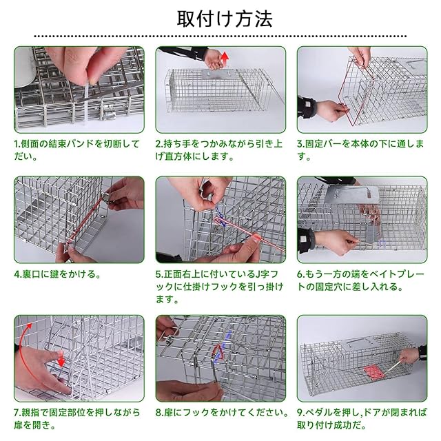 【逃げられる可能性が限りなく低い】入口から踏み板まで十分な奥行きがあり、動物が完全に入って仕掛けが作動するので、扉の開閉速度や編み目の大きさなど、小動物が傷つかないよう安全に配慮して作られているため、安心して使えます。防サビ加工済みで、丈夫な抗張力ワイヤメッシュを使用しています。耐久性が抜群で繰り返しの使用も可能です。