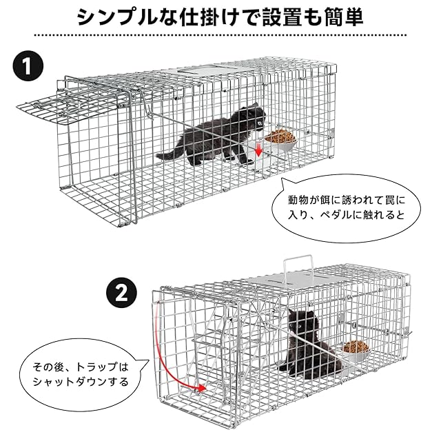 【シンプルな仕掛けで設置も簡単】 動物愛護法や鳥獣の保護及び管理並びに狩猟の適正化に関する法律 (鳥獣保護の狩猟に関する法律)に準じてお使い下さい。捕獲器の後ろの方へ餌を置き、板を踏みやすく工夫することで、しっかりと猫を閉じ込めることができます。捕まえたい小動物のサイズに合わせて捕獲器のサイズを選びしてください。