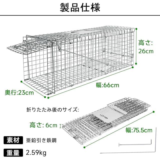 【農作物の害獣対策にもオススメ】 猫 捕獲器 サイズ :66cm×.26cm×23cm 農作物の害獣被害にお悩みの方にもオススメです。持ち運びもしやすく畑などに簡単に設置できます。猫捕獲器 高品質の鉄製、錆びにくく、丈夫で、耐候性があり屋外でも使用可能。