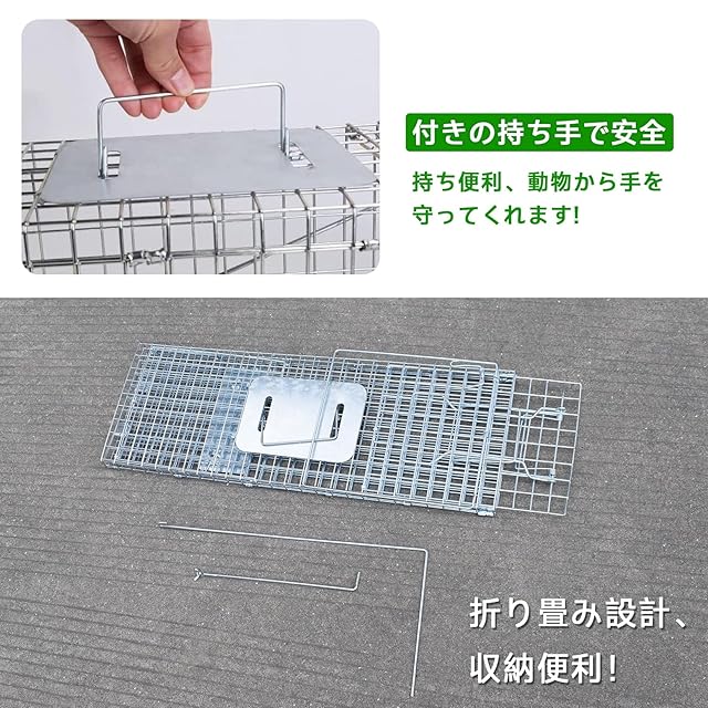 【農作物の害獣対策にもオススメ】 サイズ :66×26×23cm 農作物の害獣被害にお悩みの方にもオススメです。タヌキ、イタチ、テンなどの動物が捕獲可能です。大切に育てた農産物や植物をタヌキなどの動物から守り、被害を控えることはこの商品の役に立ちます。持ち運びもしやすく畑などに簡単に設置できます。