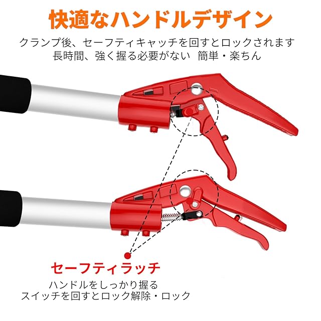 【伸縮可能なグリップ】高枝切鋏のグリップは二段式に伸縮でき、97cm~140cmの範囲で自由に調整できます。高い枝や樹木をカットする場合、階段登りは不要で、安全安心でハサミを使えます。また、調整装置が二つ付きましており、二段式でグリップを自由に伸縮できます。クリップで安全ロックが付き、刃先を閉じることができます。