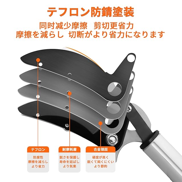 【切れ味抜群】この高枝切鋏のブレードは高精度な研磨が施しされ、鋭くて切れ味抜群です、弧状な刃先デザインはより簡単に太い枝をカットできます、波形固定の模様が設計され、よりしっかりと果物を固定できます。最大開け幅が15mmに達しています。大きい枝や太い枝にも適用、園芸、庭、花園、果樹などにも利用できます。適用シーンは非常に広いです。