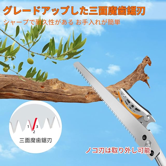【省力化】高枝切鋏は物理的なてこの原理でドライブし、グリップが長くなるほど、より省力化になります。ABS材質のグリップは握り心地良く、滑り止めも付きでありながら、厚くグリップ設計はお客様の手には優しく、負担をかかりません。三面研磨をしたノコ刃が付属しており、ノコ刃は自由に取り付けや外しが可能です。