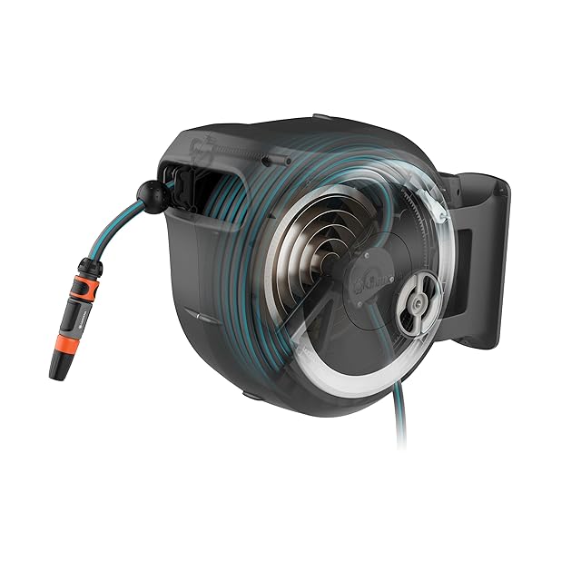 配送物の内容:GARDENA Wall-Mounted Hose Box RollUp S 15m 18602-20 ※ホース15m(直径11mm)×1、連結ホース×1、ホースノズル、壁掛け用セット(ねじ付き)、壁面プラグ 最大5年