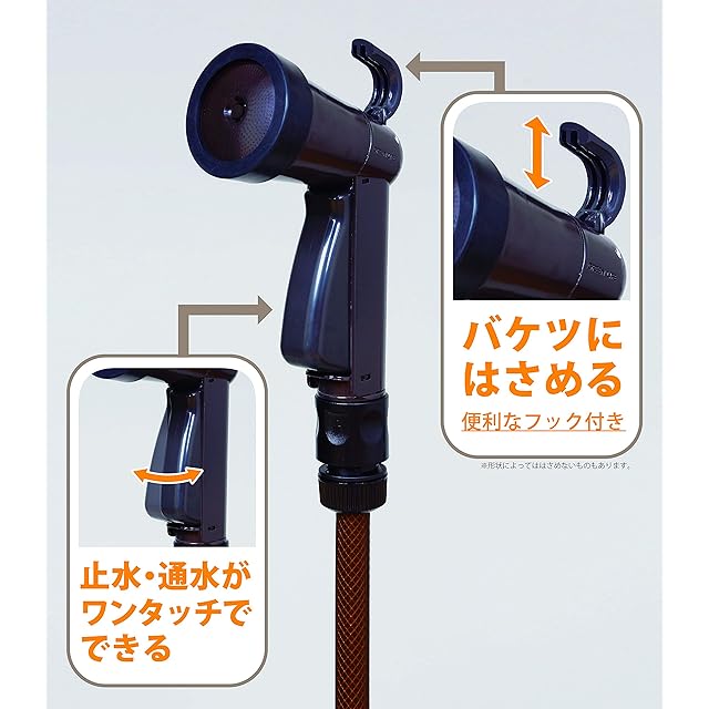 【バケツへの水溜めラクラク】ノズルの上部にひっかけ機能が付いていて、バケツへ固定して水を溜めることができます。