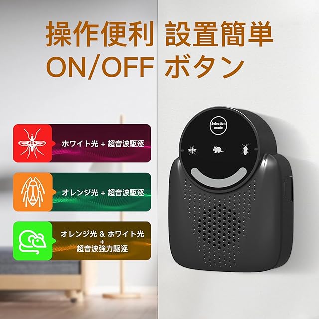 【使用簡単・多種類超音波モード】こちら商品はUSB給電で、電池交換や充電は一切ありません、消費電力も少ないので、長時間使用しても電気代の心配がありません。地面から20 -15cmぐらい場所に垂直でおいてください。3種類の超音波モードの切り替えにより、ほとんどの害虫を効果的に除去。鼠/ねずみ/マウス、ゴキブリ、ダニ、シロアリ、ハチ、蚊、虫、ハエ、クモ、アリ、ノミ、コウモリなどの多種類の動物対応できます。せめて2-4週間をご使用ください。1-2週ぐらい、害虫の嗅覚神経が刺激され、周りに走り回る。2-3週後、良い効果が発揮できます。 3-4週間の後期、害虫がほとんど駆除されます。