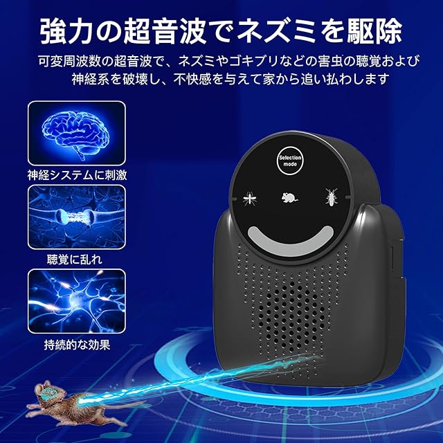 【超音波式ネズミ撃退 】超音波ネズミ駆除器は最先端のマイコン制御原理を採用しています、超音波、生体模倣波の交互变换を実現しネズミ、蚊、ゴキプリなどの害虫の聴覚系と神経系を刺激します、暗闇に隠れているネズミなどの害虫を強制的に退去させます。ネズミ、ゴキブリ、蚊、ノミ、シロアリ、ハチ、ハエ、ダニ、虫、アリ、クモ、コウモリなどの多種類の動物対応できます。注:この製品は屋内の害虫を撃退するもので、殺虫効果はありません。