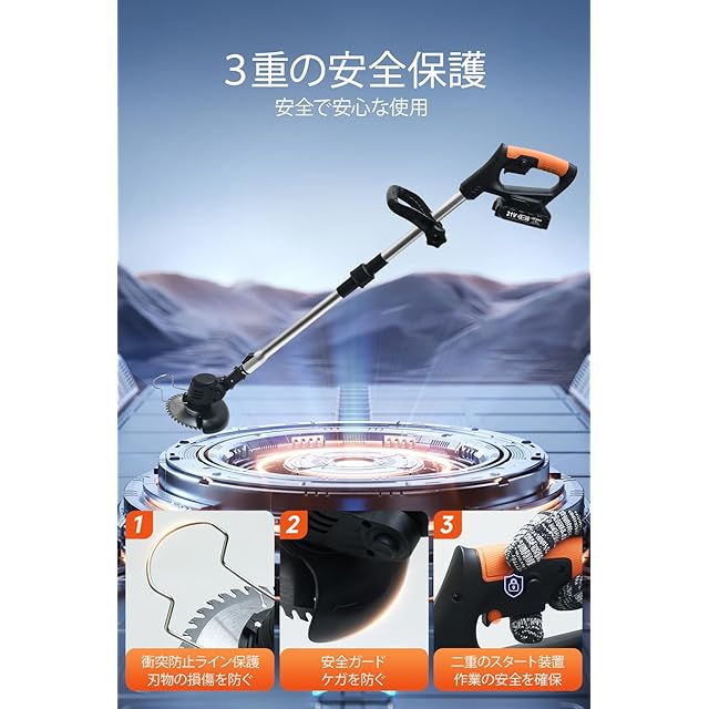【角度調整可能、多重保護】作業ヘッドは最大90度まで回転し、さまざまな地形と用途に適応します。二重起動装置が充電式草刈機の作業の安全をし、保護カバーが雑草の飛散を防ぎ、底部の防衝撃線が刃物を保護します。安全で便利な充電式草刈機の刈り込みの楽しみをお楽しみください!