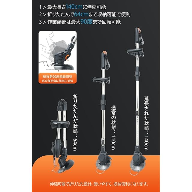 【柔軟な伸縮、便利な収納】ステンレス製伸縮ポールは、自在に伸縮し、最大で140cmまで延長可能であり、折りたたむとわずか110cmになり、充電式草刈機の収納と持ち運びが容易です。身長に応じて調整でき、腰部と脚部の負担を軽減します。充電式草刈機を折りたたんだ状態では、わずか64cmで、車に持ち運びやすく、場所を取りません。