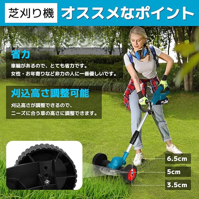 【一機両用式のコードレス草刈り機】草刈り機は、草刈りの効率アップに役立つアイテムです。伸びてしまった草や固くなった枯れ草などをガンガン刈ってくれます。コードレス草刈機はどこでも気軽に使えます!コードレスでコンセントの確認等の電源確保のストレスから解放!電源がない場所でも使え、取り回しも楽なので作業効率もアップします。壁際や低い場所も手楽にカットできます。また、一機両用なので、草刈り機として使用できて、芝刈り機としても使用できます。使用環境・使用者の力状態による、草刈り機と芝刈り機の使用形態に自由に変換できます。★刈込高さ35mmは一番低いので、長い草を刈るときに、刈った草屑が草刈り機ヘッドに詰めた場合があります。その時、草刈り機を停止して、詰めた草屑を取り除いてください。予めご了承ください。