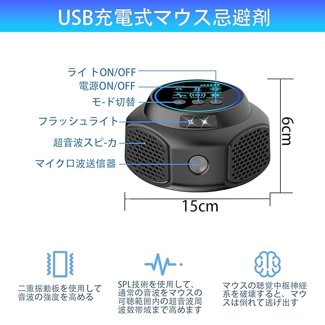 安全性と信頼性:発する超音波は物理的原理により害虫の生息環境を改善し、ねずみ駆除を実現します。超音波の周波数範囲は25-65kHzで、人間の聴覚に影響を与えません。無毒無害、子供やペットに対する悪影響はありません、安全・安心してご使用いただけます。