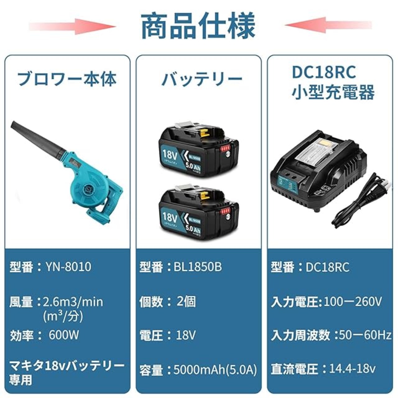 VANKO ブロワー 充電式ブロワー YN-8010 軽量化 トリガー風量調整 コートレス 互換 マキタ 18v バッテリー BL1850B BL1860B 2個付きとマキタ 充電器 DC18RC 付き 送風と集じんの1台2役 集塵 落ち葉の吹き飛ばし 庭掃除 洗車 青 | つむぎ屋