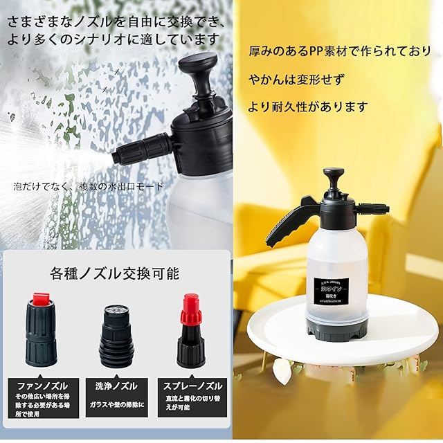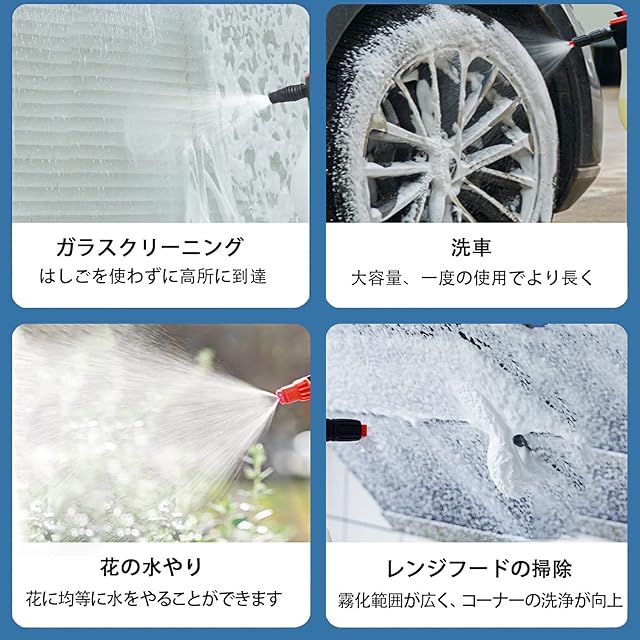 【使いやすい】温水と洗剤を適切な割合で混ぜるだけで簡単に泡を作ることができ、ポンプを始動させて圧力を発生させ、蓄圧式 泡が、パルス、滝の霧などを含む3つの機能を備えたスプレーヘッド,ノズルを細かくミストからジェットに調整し、あらゆるタイプの洗車や高圧洗浄石鹸に適しています。
