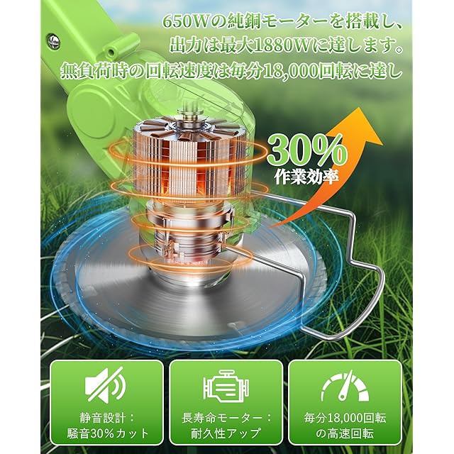 草刈り機 充電式 650W純銅モーター搭載 最大出力1880W 大容量21Vバッテリー2個付属 静音・低振動設計 軽量1.5kg 4種替刃と補助車輪付き 多重安全保護 屋外作業・家庭用・プロ用に最適な電動草刈機セット 緑色 | つむぎ屋