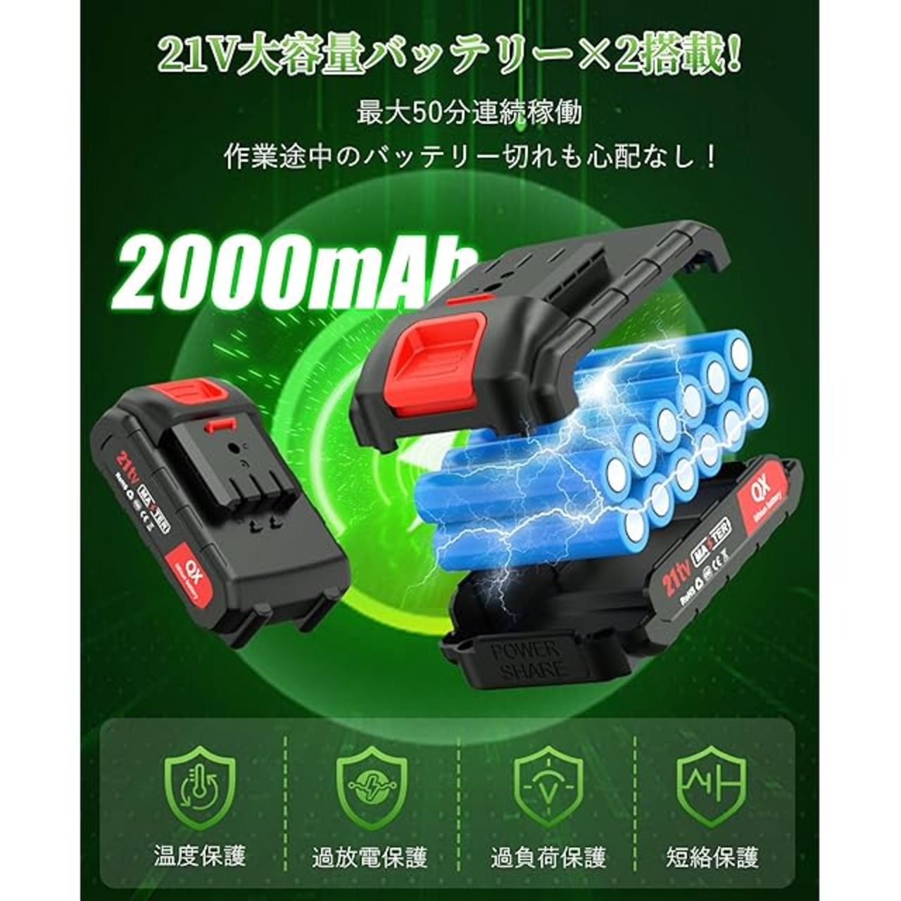 2.デュアル21Vバッテリー搭載 - 最大50分連続使用&四重保護機構:2つの21V大容量リチウム電池を搭載し、連続使用時間は最大40〜50分に達します。作業中でも途中充電が可能な設計のため、広範囲での使用時にもバッテリー切れの心配がありません。また、過電流・過熱・過負荷・短絡の四重保護設計により、安全性を高めるとともに、安定した動作とバッテリーの長寿命化を実現しています。