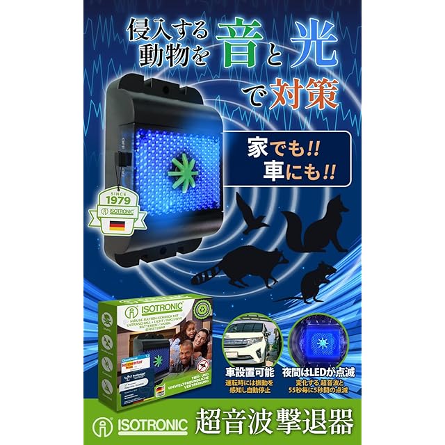 【超音波で動物よけ】動物の好まない周波数の超音波を出すので、動物が習慣的に来るような場所においておくことで、動物の住みづらい環境を作ります