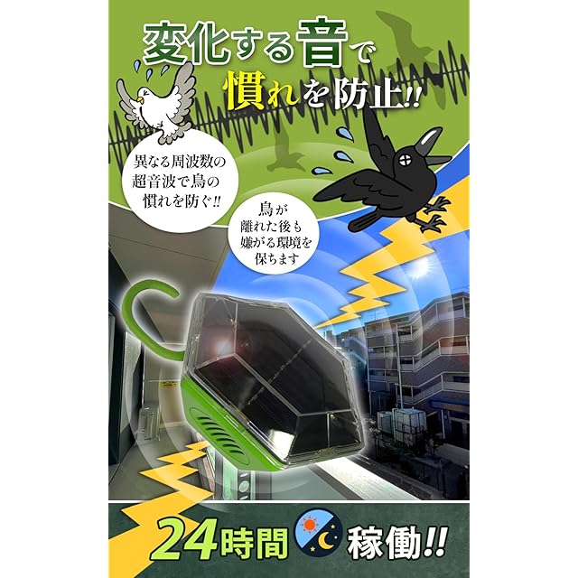鳥の好まない周波数の超音波を出すので、鳥が習慣的に来るような場所においておくことで、鳩やカラスなどの鳥よけの効果があります。