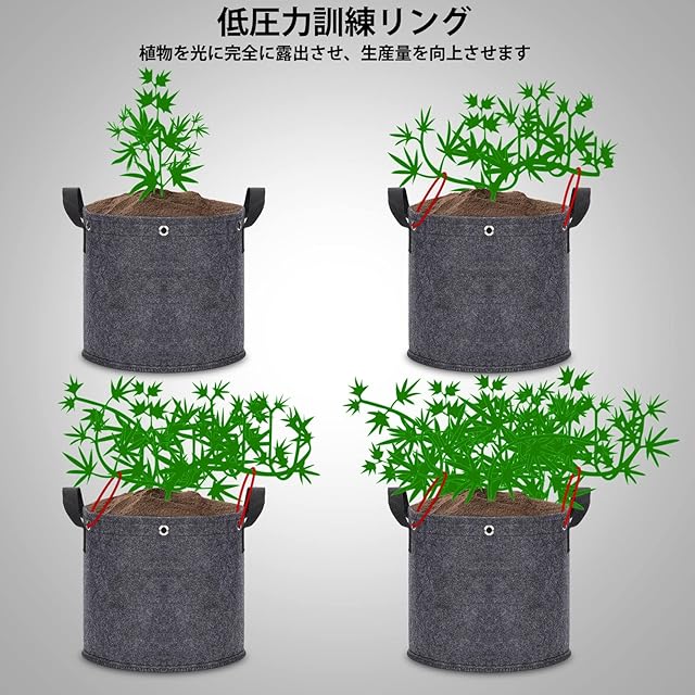 【低圧力植物ト訓練 商品情報】320G不織布、1ガロン 5枚セット(幅18×高15cm)、DRNCURN不織布プランターは金属リングを内蔵しており、訓練垂直方向の成長ではなく水平方向の成長を促進し、植物全体の空気循環を改善し、カビや害虫の侵入のリスクを軽減し、均一な配光を確保することで、収穫量アップも期待できます。