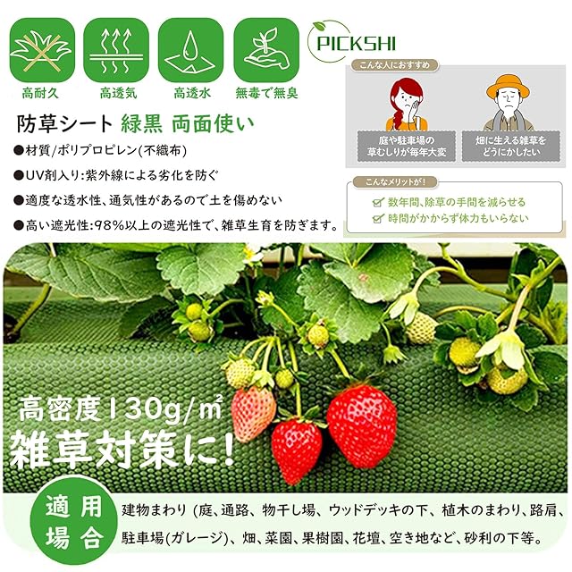 PICKSHI 【緑黒両面】防草シート 1.6*30m 雑草防止シート 130g/m²高密度 5-8年耐久 グリーン 黒両面使い トウモロコシ繊維 PLA製 丸穴設計 高耐久 除草シート 高透水 厚手不織布 草よけシート UV剤入り 紫外線劣化防止 園芸用ぼうそうしーと (130G 160CM*30M)